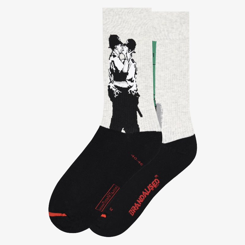 In a cheeky twist of authority and affection, Banksy’s Kissing Coppers captures two British policemen locked in a passionate kiss—uniforms crisp, love uncontained. Stenciled originally on a pub wall in Brighton, this iconic piece flips the script on masculinity, power, and public perception, proving that even badges can blush. With classic Banksy wit, it’s part protest, part poetry, and all heart—sprayed with subversion and sealed with a smooch.